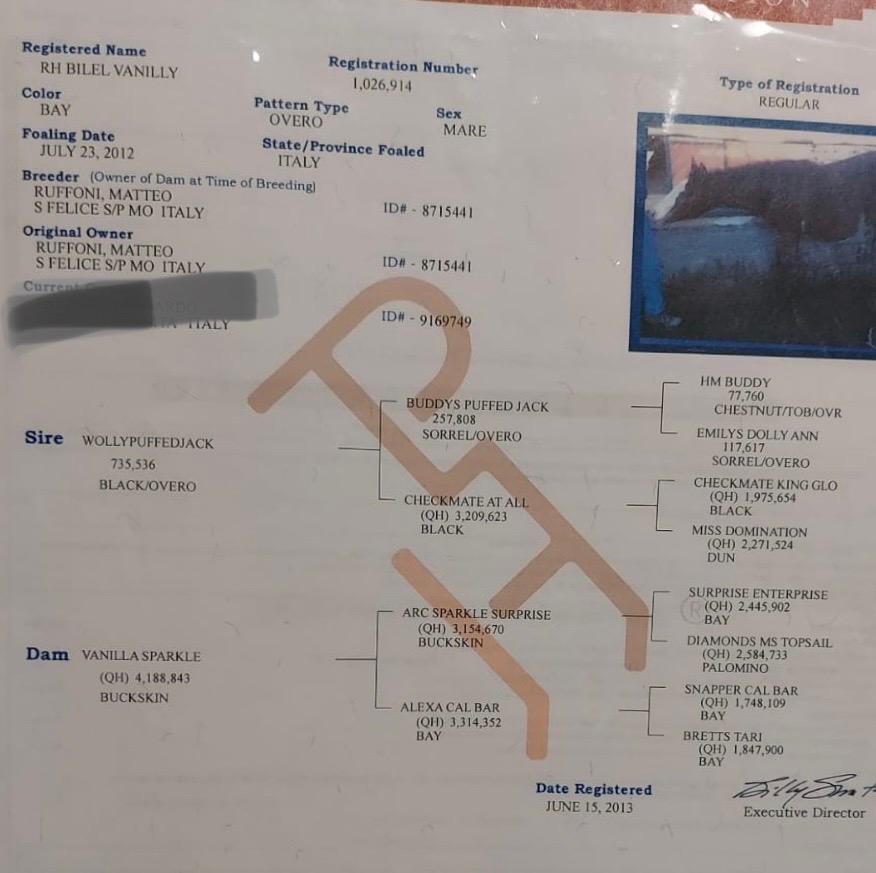 | Dam VANILLA SPARKLE buck 2001 QUARTER HORSE ![]() | Ex ALEXA CAL BAR QUARTER HORSE AQHA # By SNAPPER CAL BAR ![]() NCHA $248,987 COA NCHA Non-Pro Futurity Champion NCHA Open Derby Co-Champion. Breeding Stallion in Italy. Sire of many Champions. Winning get include: 2003 Open Derby NRHA of Germany, 2003. 2004 Open + Non Pro Derby NRHA of Germany, 2004 Italian Open Futurity and many more. Deceased. |