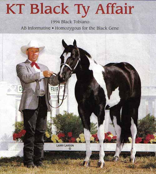 | By KT BO JO 2000 PAINT By KT BLACK TY AFFAIR ![]() Homozygous Black; APHA Champion; ROM Halter 25 points, 8 Trail points, ROM Western Pleasure, 27 points. | |